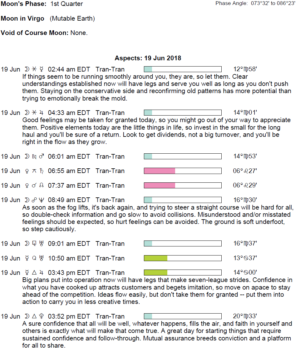 Planet Color Key: The longer the bar, the slower the aspecting planet and the longer the duration of the planet’s transit.