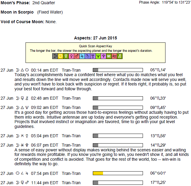 The following aspects (major only) and positions are at noon (EDT) on June 27th: