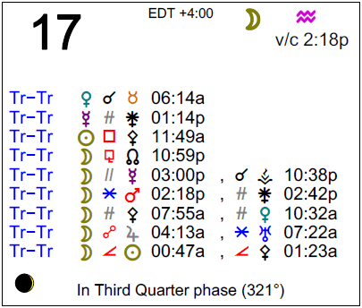 - The Moon is in Aquarius all day (until Wednesday, March 18th, at 6:58 AM).