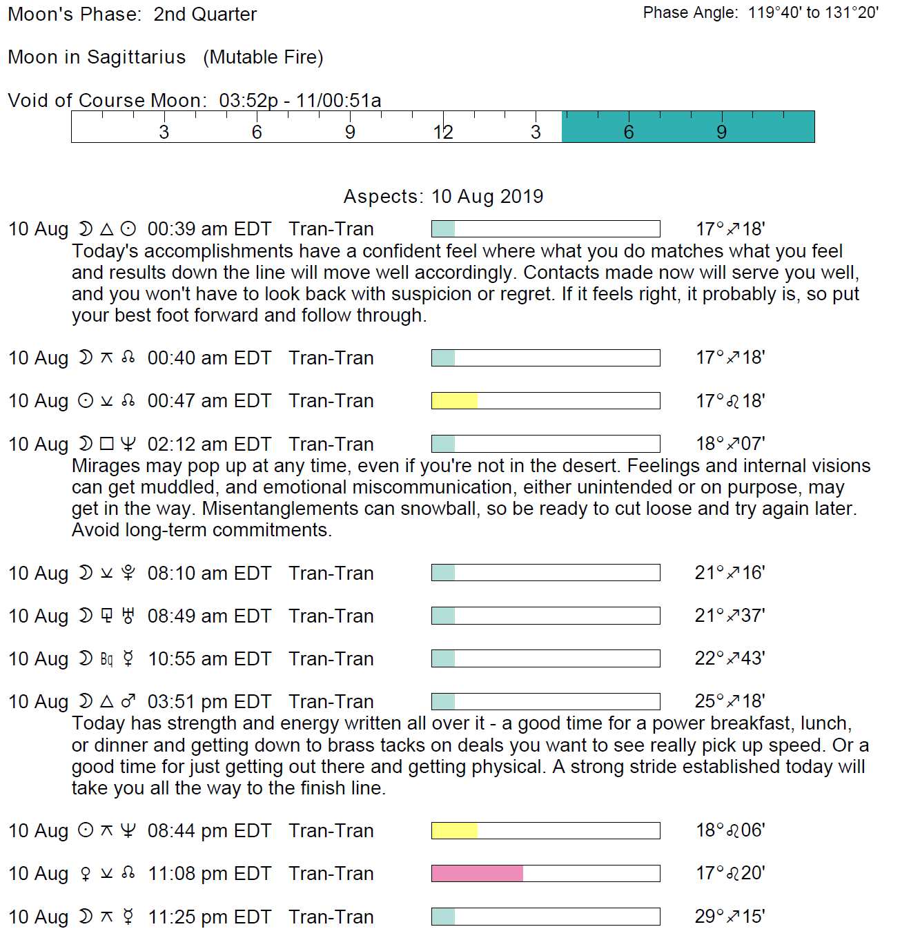 Planet Color Key: The longer the bar, the slower the aspecting planet and the longer the duration of the planet’s transit.