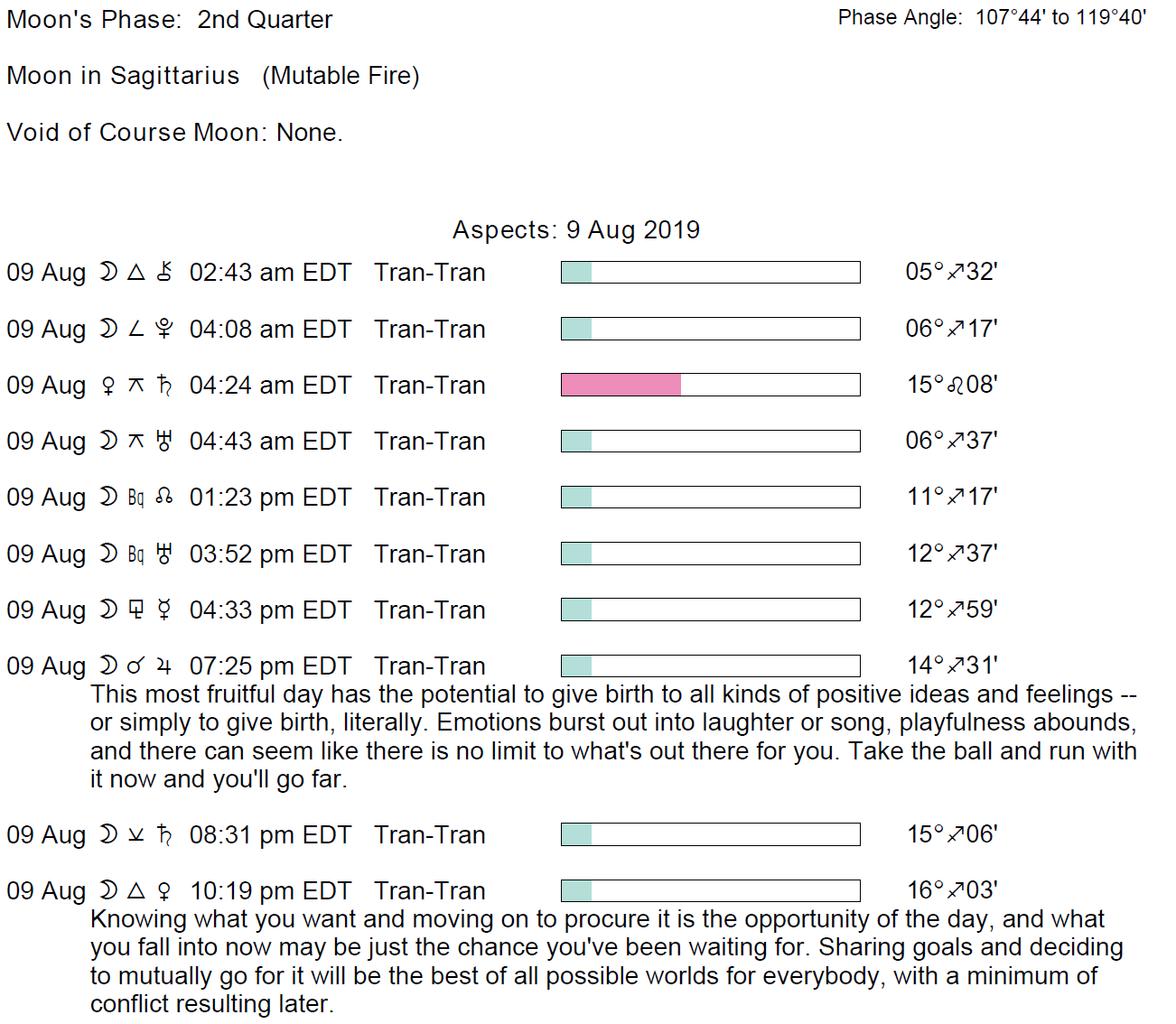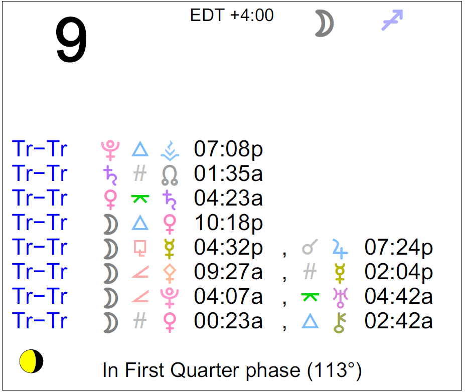 Planet Color Key: The longer the bar, the slower the aspecting planet and the longer the duration of the planet’s transit.