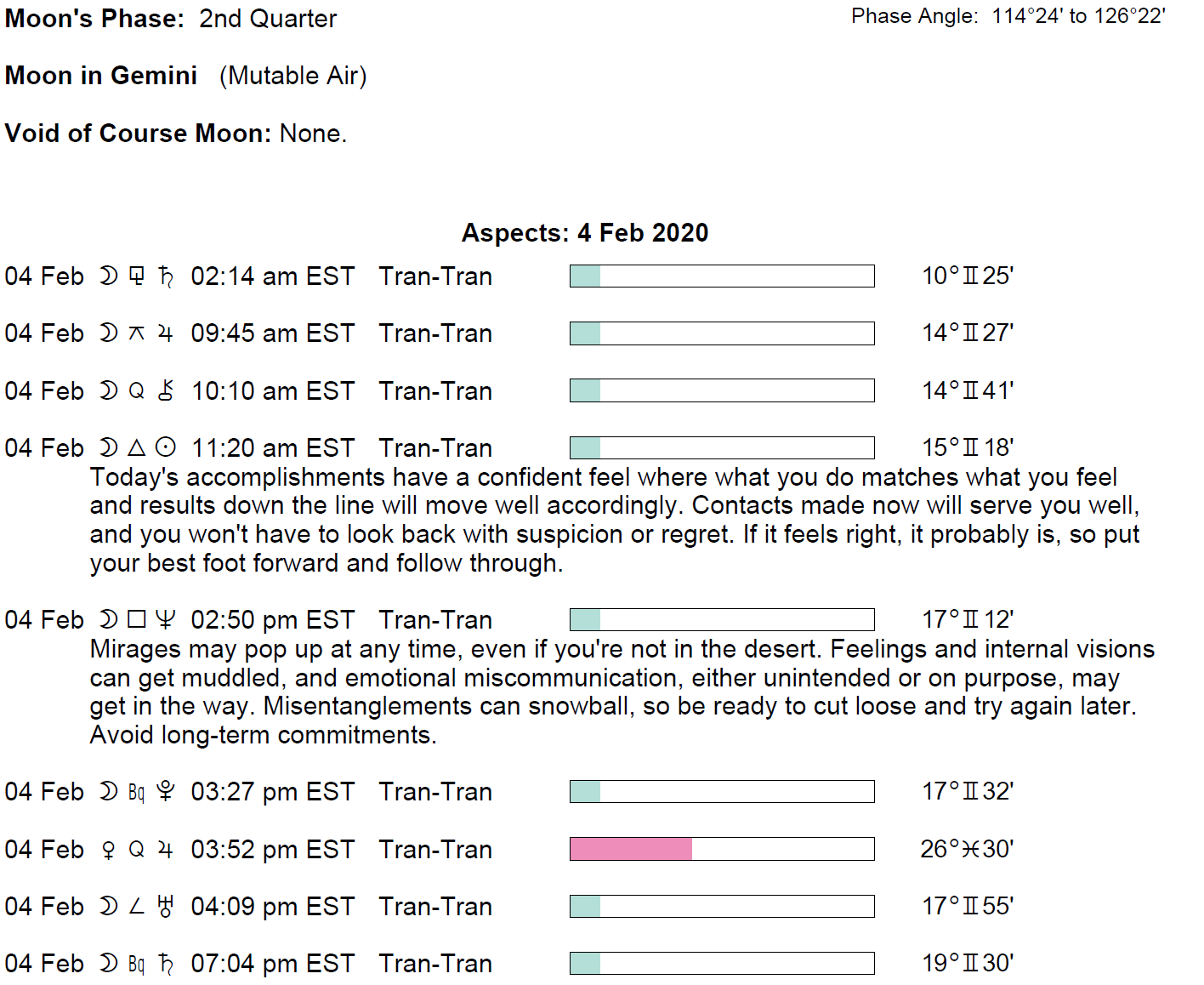Planet Color Key: The longer the bar, the slower the aspecting planet and the longer the duration of the planet’s transit.