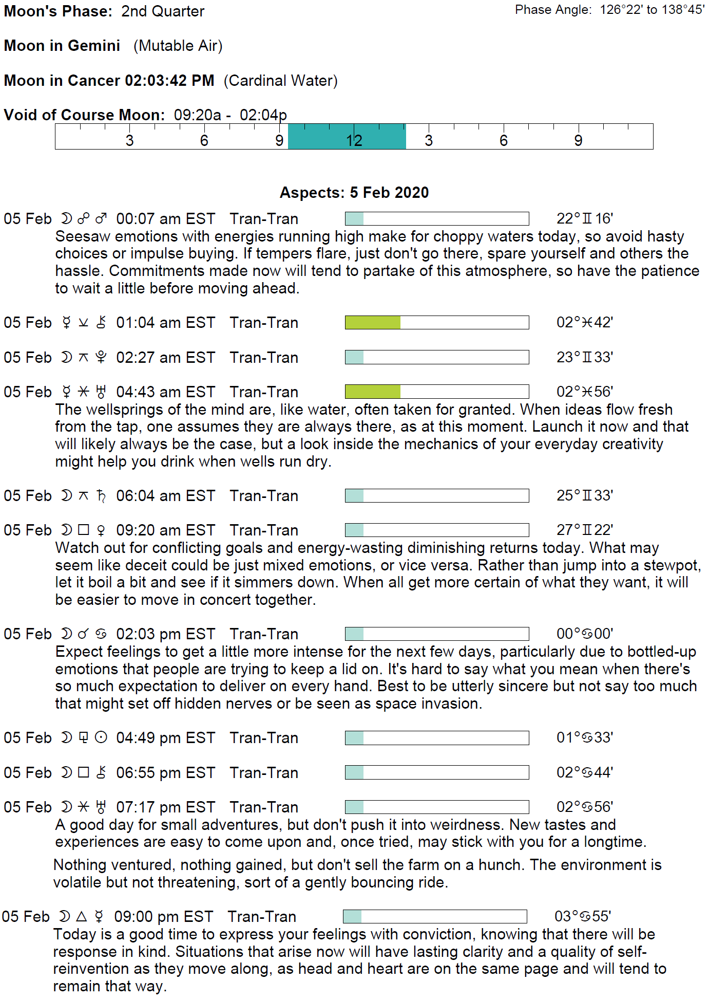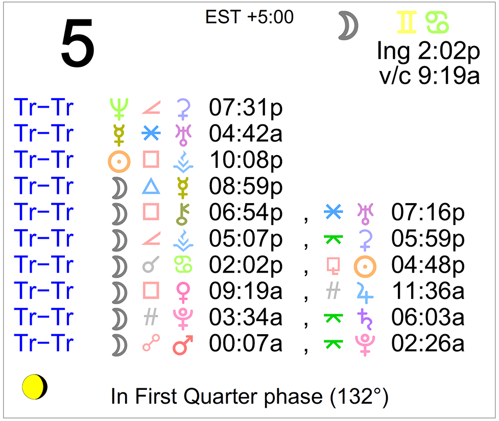 Planet Color Key: The longer the bar, the slower the aspecting planet and the longer the duration of the planet’s transit.