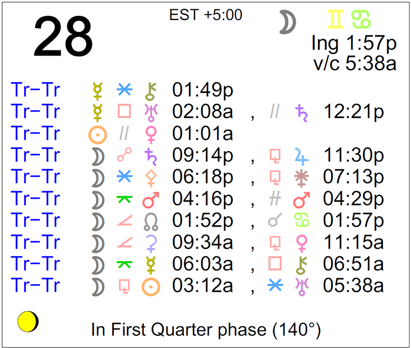 - The Moon is in Gemini until 1:57 PM, after which the Moon is in Cancer.