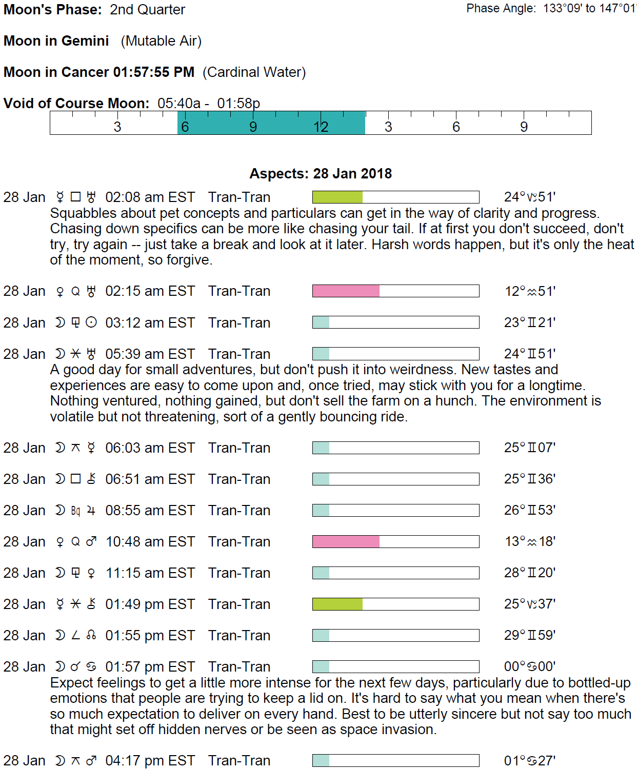 Planet Color Key: The longer the bar, the slower the aspecting planet and the longer the duration of the planet’s transit.
