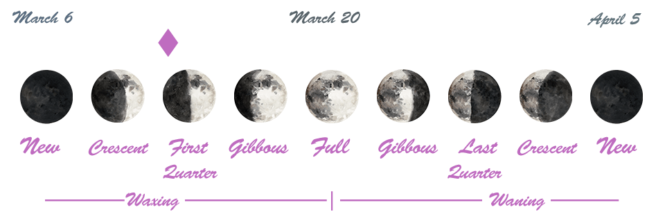 - The New Moon occurred on March the 6th in the sign of Pisces, and the First Quarter Moon will happen tomorrow.