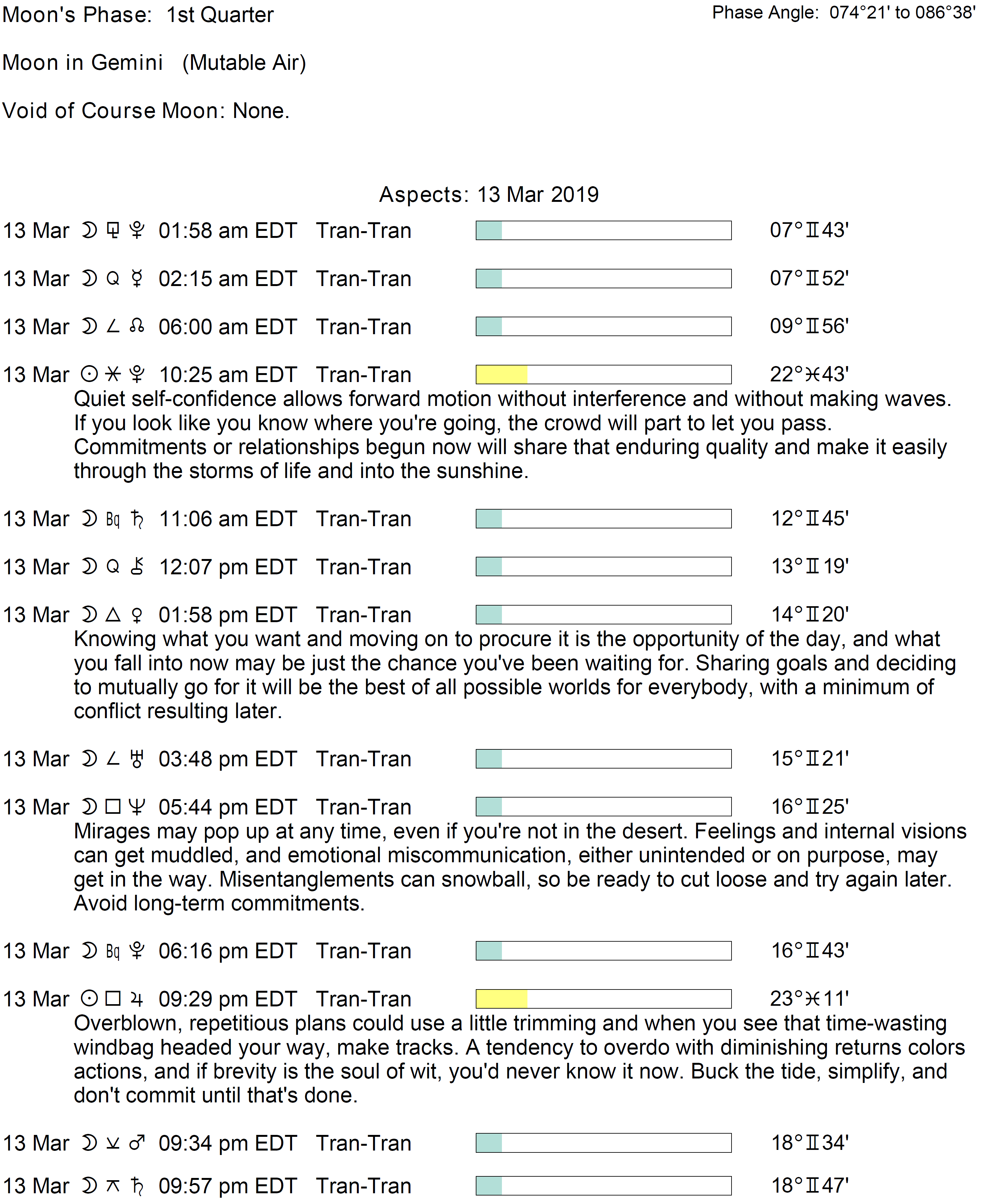 Planet Color Key: The longer the bar, the slower the aspecting planet and the longer the duration of the planet’s transit.