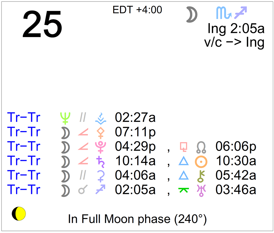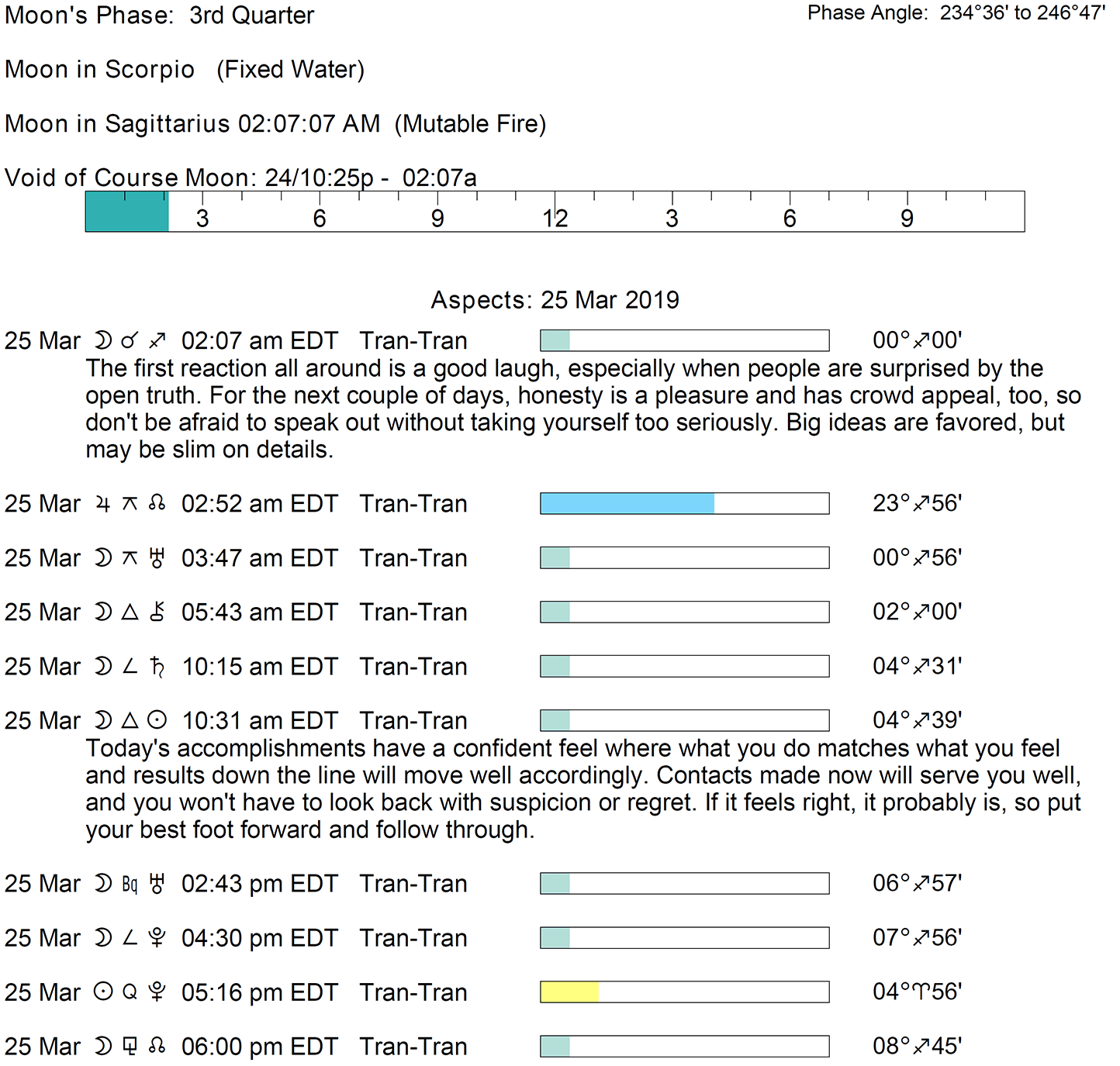 Planet Color Key: The longer the bar, the slower the aspecting planet and the longer the duration of the planet’s transit.