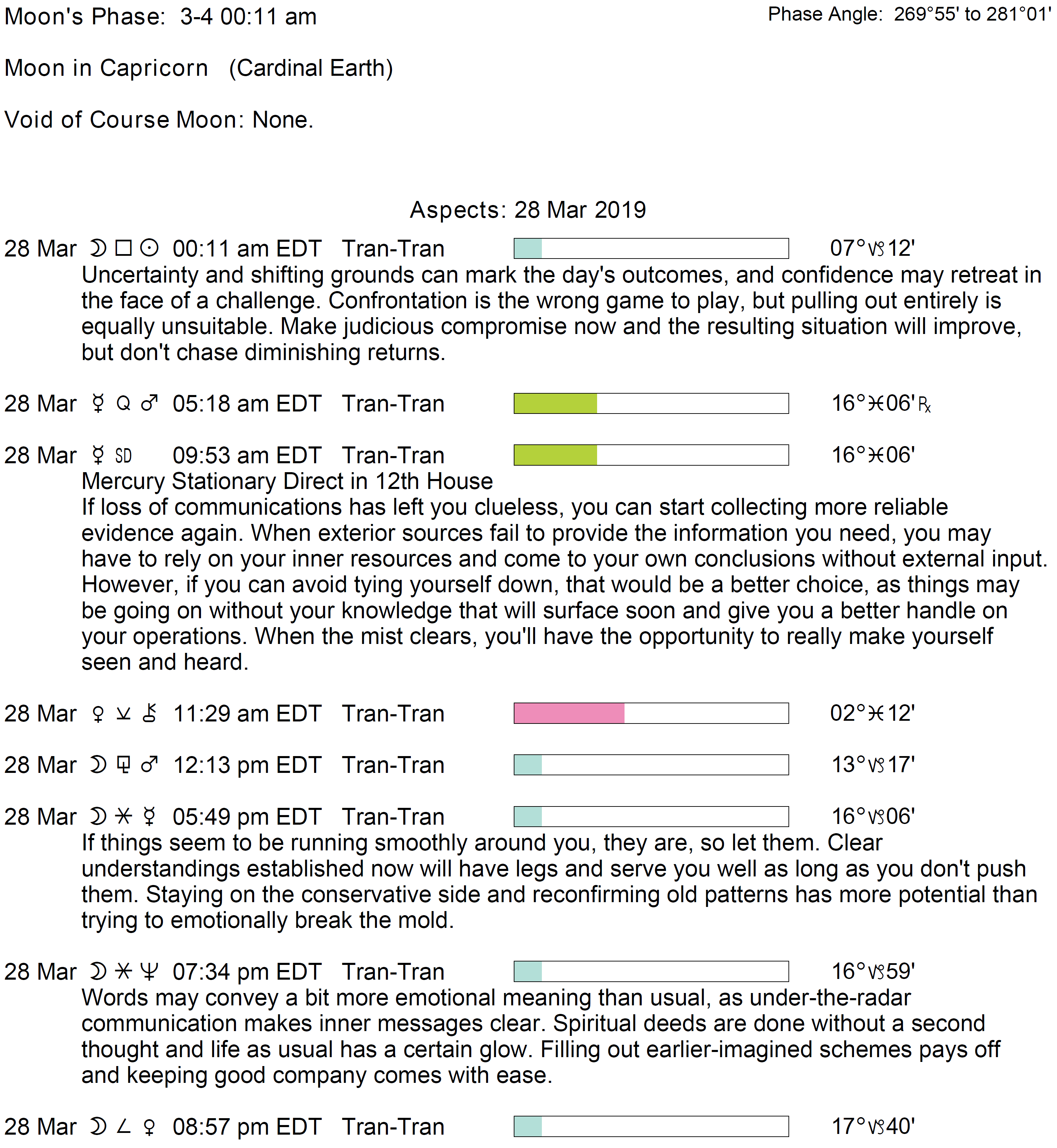 Planet Color Key: The longer the bar, the slower the aspecting planet and the longer the duration of the planet’s transit.