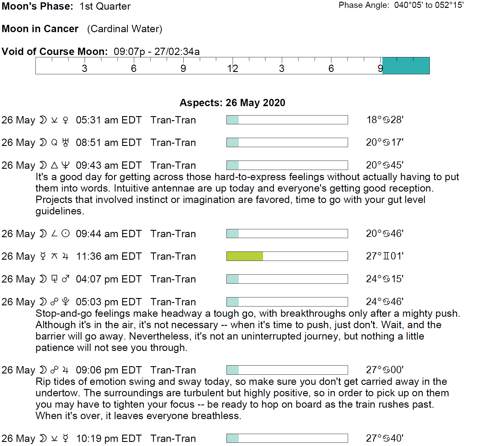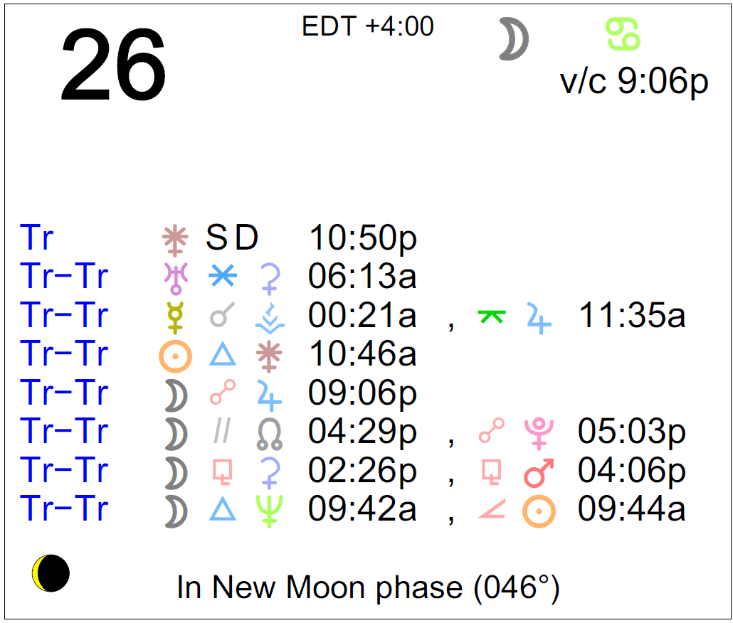 Planet Color Key: The longer the bar, the slower the aspecting planet and the longer the duration of the planet’s transit.