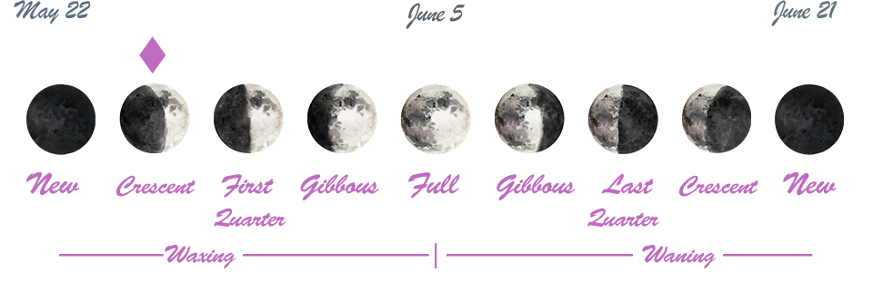 - The New Moon occurred on the 22nd in the sign of Gemini, and the First Quarter Moon will happen on May 29th.