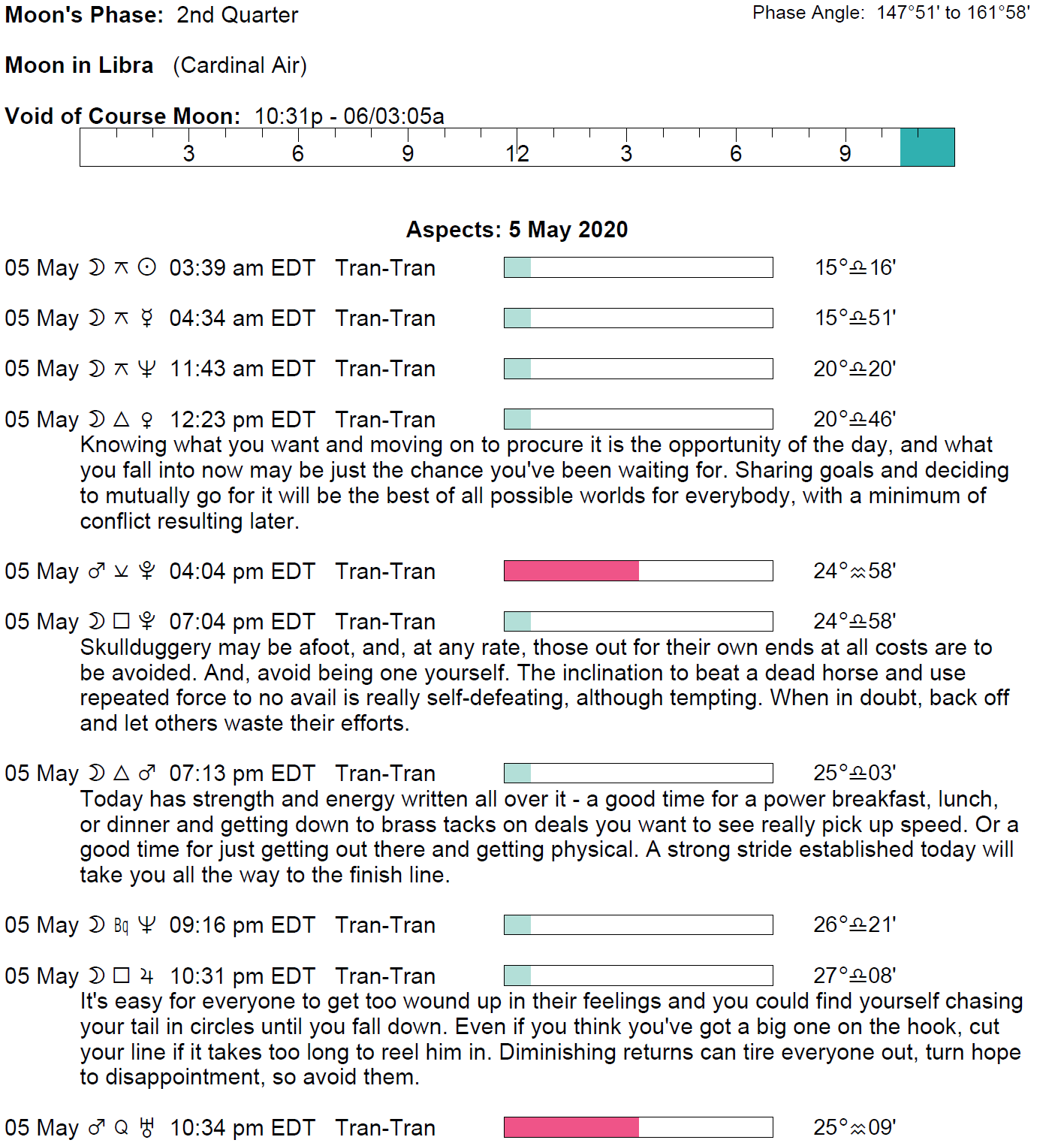 Planet Color Key: The longer the bar, the slower the aspecting planet and the longer the duration of the planet’s transit.