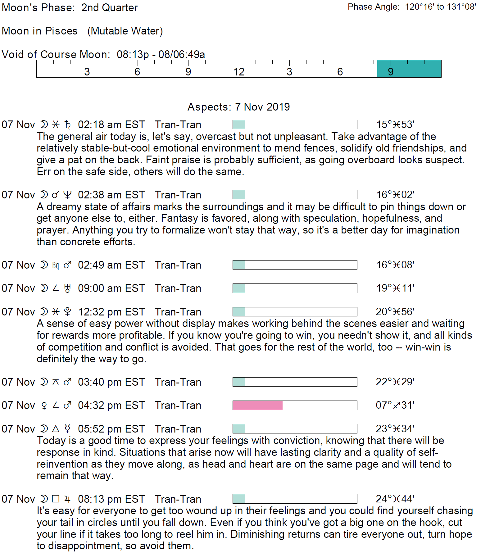 Planet Color Key: The longer the bar, the slower the aspecting planet and the longer the duration of the planet’s transit.