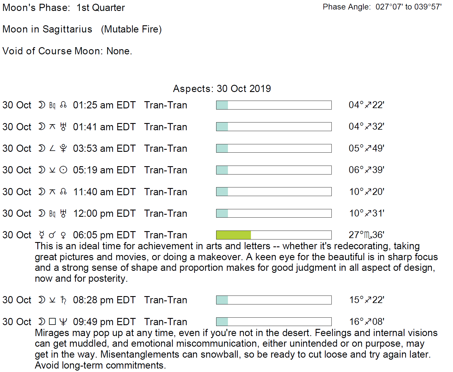 Planet Color Key: The longer the bar, the slower the aspecting planet and the longer the duration of the planet’s transit.