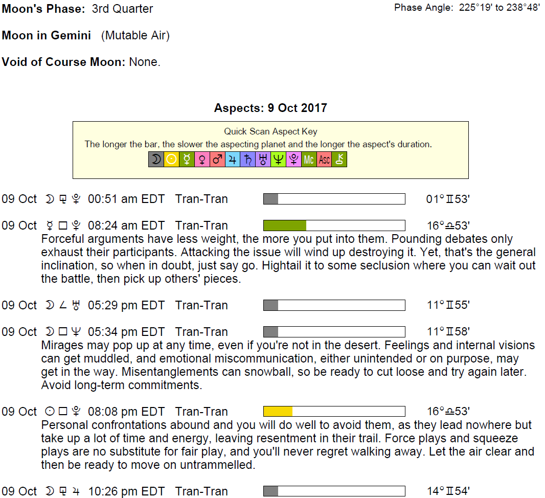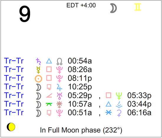 The following aspects (major only) and positions are at noon (EDT) on October 9th: