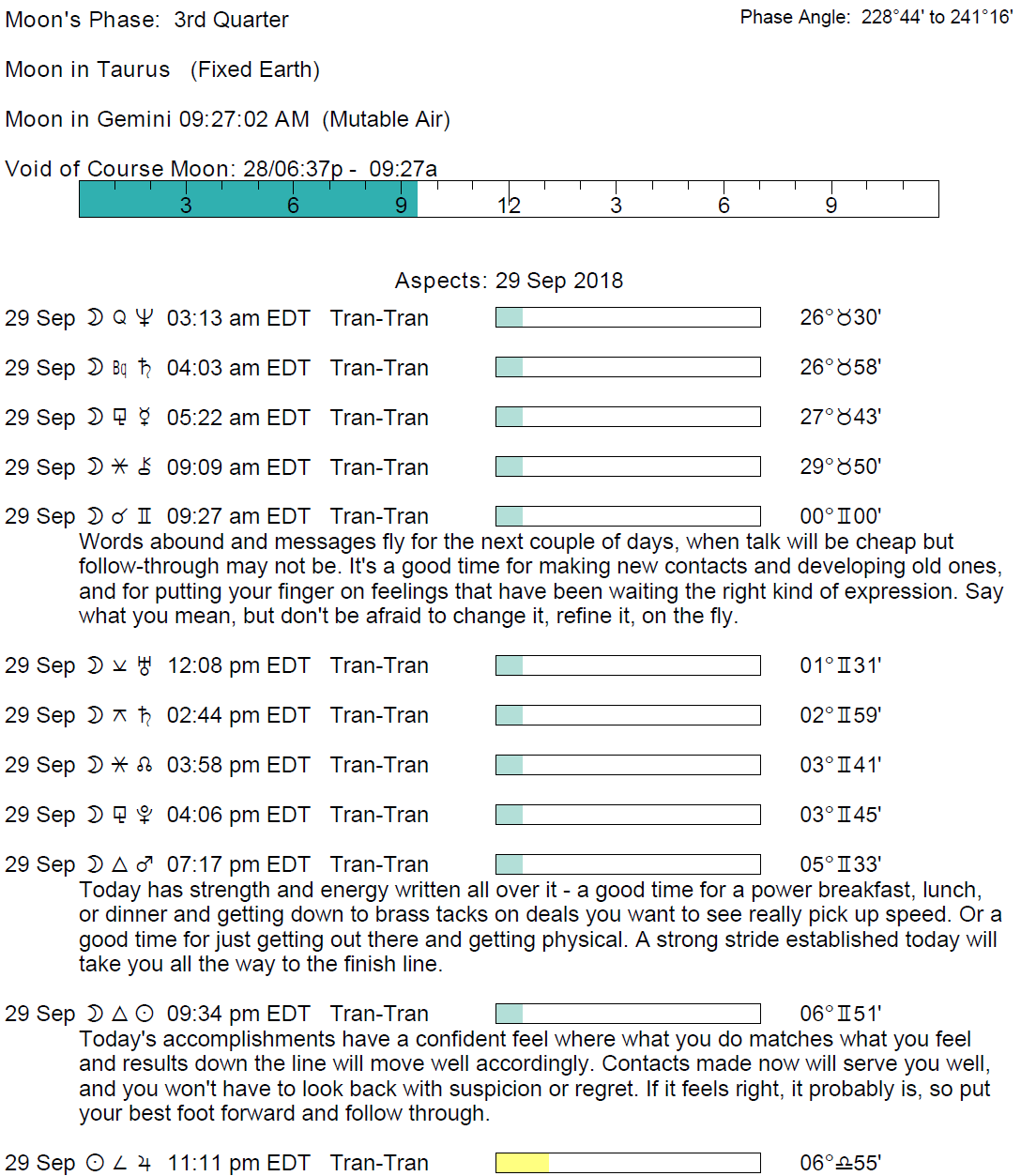 Planet Color Key: The longer the bar, the slower the aspecting planet and the longer the duration of the planet’s transit.
