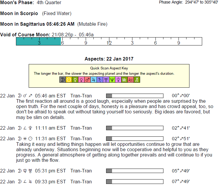 The following aspects (major only) and positions are at noon (EST) on January 22nd: