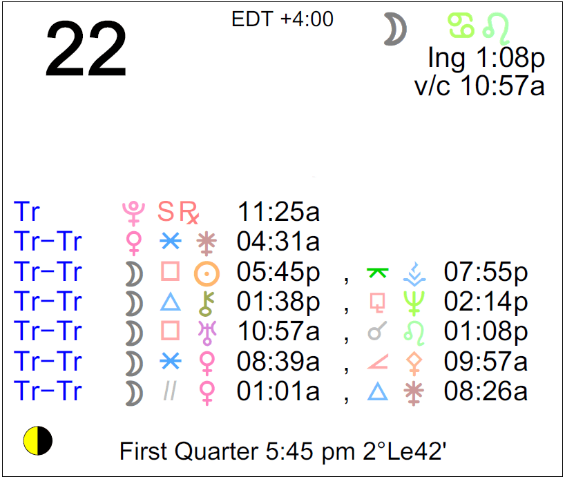 The Moon is in Cancer until 1:08 PM, after which the Moon is in Leo.- The Moon is void from 10:57 AM to 1:08 PM.