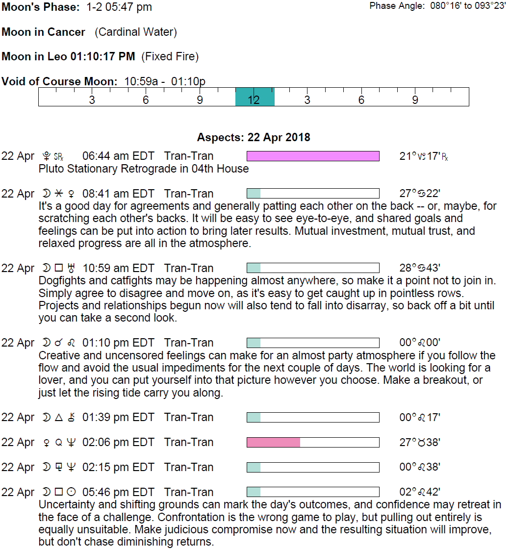 Planet Color Key: The longer the bar, the slower the aspecting planet and the longer the duration of the planet’s transit.