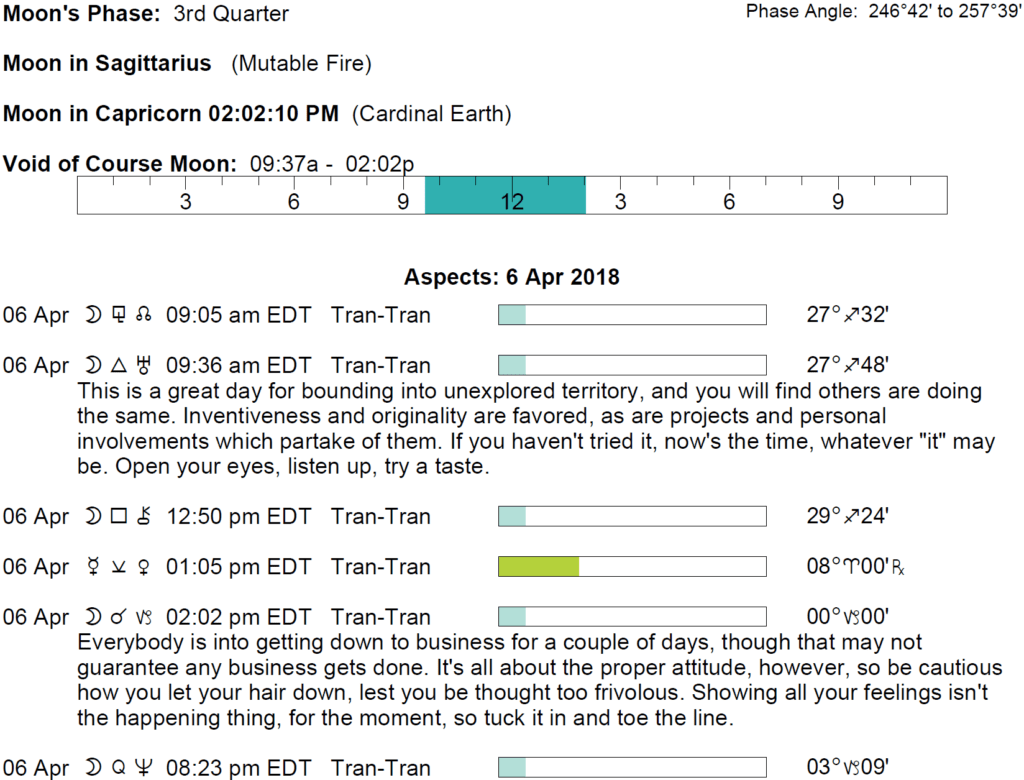 Note that the Moon moves at a rate of approximately one degree every 2 hours so that if an aspect involving the Moon is applying and has an orb of 5 degrees, the aspect will perfect (be exact) in about 10 hours. If the Moon is separating from an aspect with an orb of 2 degrees, it has already formed said aspect approximately 4 hours ago (since the following are positions at noon today, then it would have occurred at about 8 AM today).