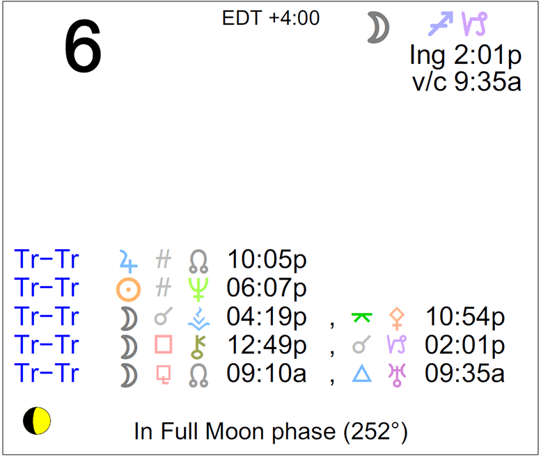 The following aspects (major only) and positions are at noon (EDT) on April 6th:
