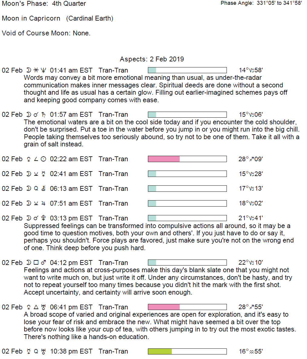 Planet Color Key: The longer the bar, the slower the aspecting planet and the longer the duration of the planet’s transit.