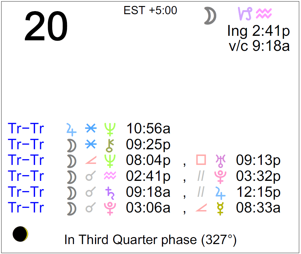 - The void Moon occurs from 9:18 AM to 2:41 PM.