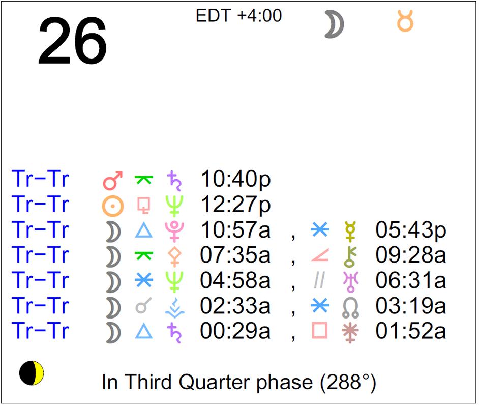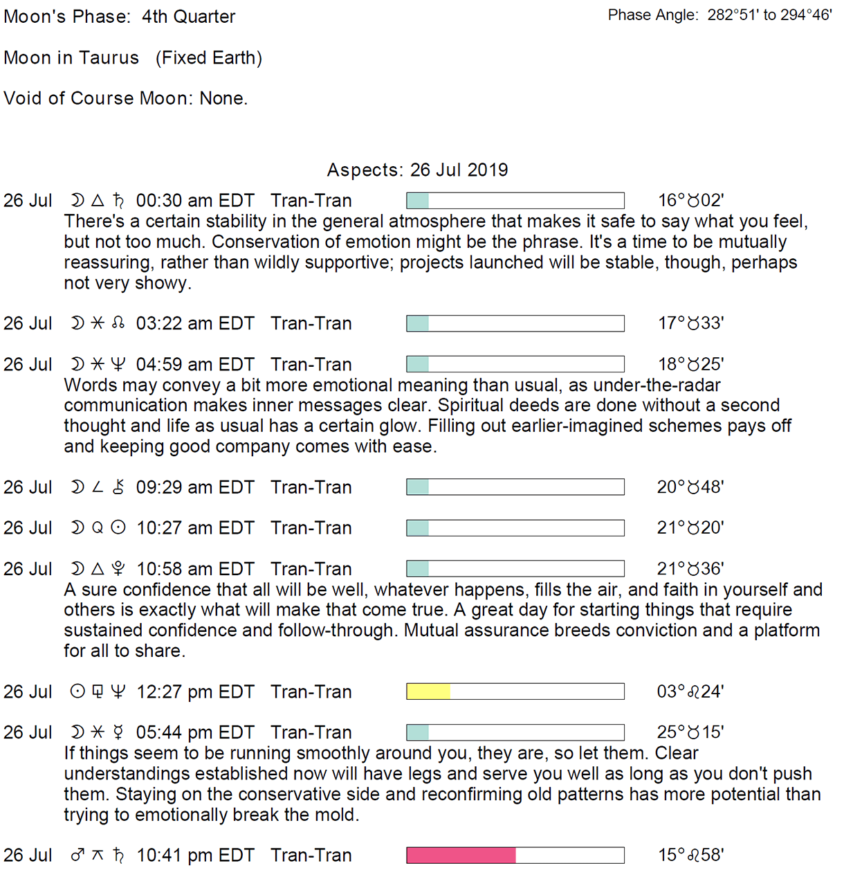 Planet Color Key: The longer the bar, the slower the aspecting planet and the longer the duration of the planet’s transit.