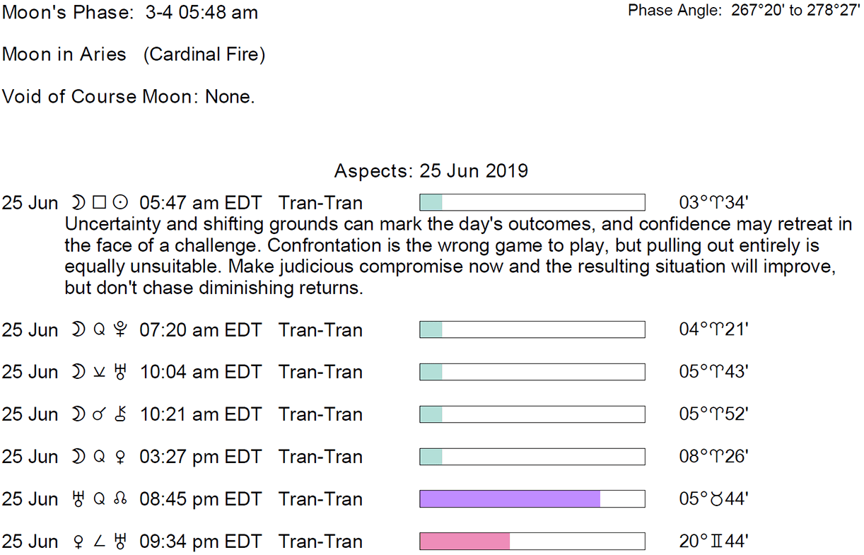 Planet Color Key: The longer the bar, the slower the aspecting planet and the longer the duration of the planet’s transit.