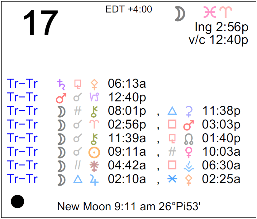 The Moon is in Pisces until 2:56 PM, after which the Moon is in Aries.- The Moon is void from 12:40 PM to 2:56 PM.