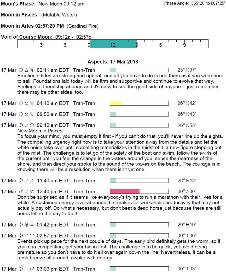 Planet Color Key: The longer the bar, the slower the aspecting planet and the longer the duration of the planet’s transit.