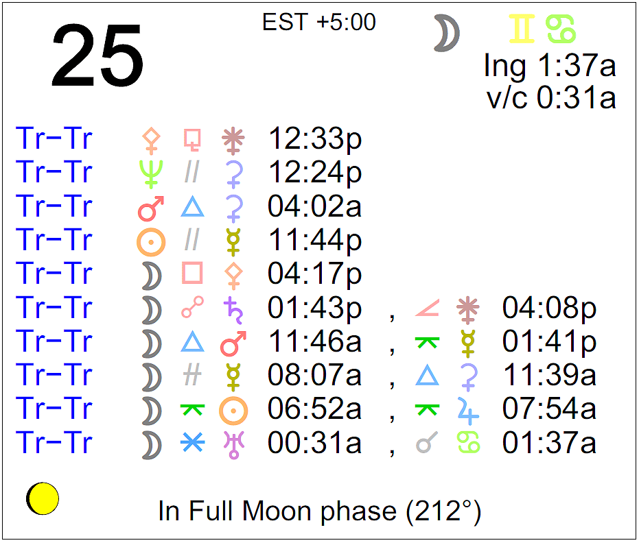 Planet Color Key: The longer the bar, the slower the aspecting planet and the longer the duration of the planet’s transit.