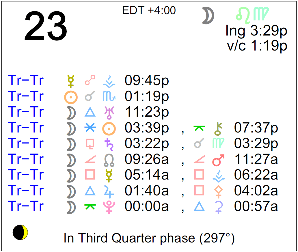 Planet Color Key: The longer the bar, the slower the aspecting planet and the longer the duration of the planet’s transit.