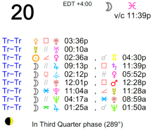 The Moon is in Pisces. The Moon is void from 11:39 PM forward (until tomorrow at 6:10 AM) The Moon is waning and in its Last Quarter phase. The Last Quarter Moon occurred on … [Read more...]