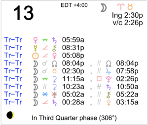 Today's Moon: The Moon is in Aries until 2:30 PM, after which the Moon is in Taurus. A void Moon period occurs from 2:26 PM to 2:30 PM today. The Moon is waning and in its Last Quarter … [Read more...]