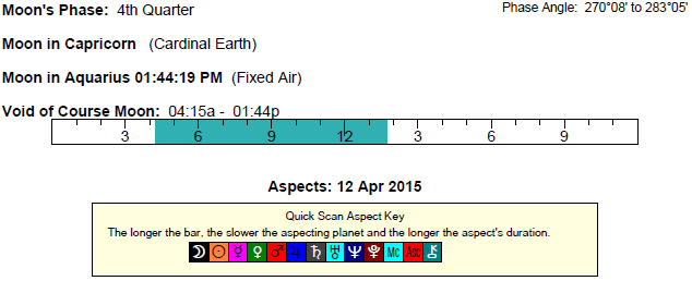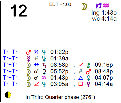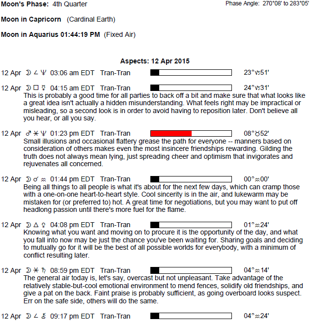The following aspects (major only) and positions are at noon (EDT) on April 12th:
