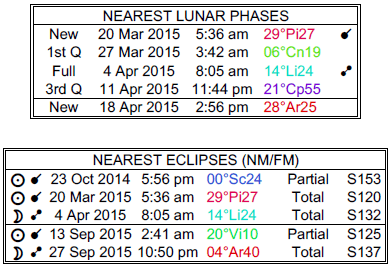 Note that the Moon moves at a rate of approximately one degree every 2 hours, so that if an aspect involving is applying and has an orb of 5 degrees, the aspect will perfect (be exact) in about 10 hours. If the Moon is separating from an aspect with an orb of 2 degrees, it has already formed said aspect approximately 4 hours ago (since the following are positions at noon today, then it would have occurred at about 8 AM today).