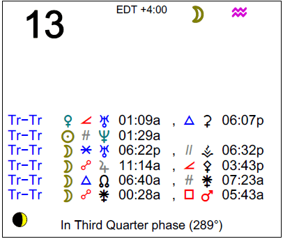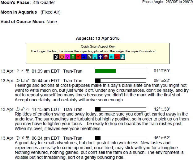 The following aspects (major only) and positions are at noon (EDT) on April 13th:
