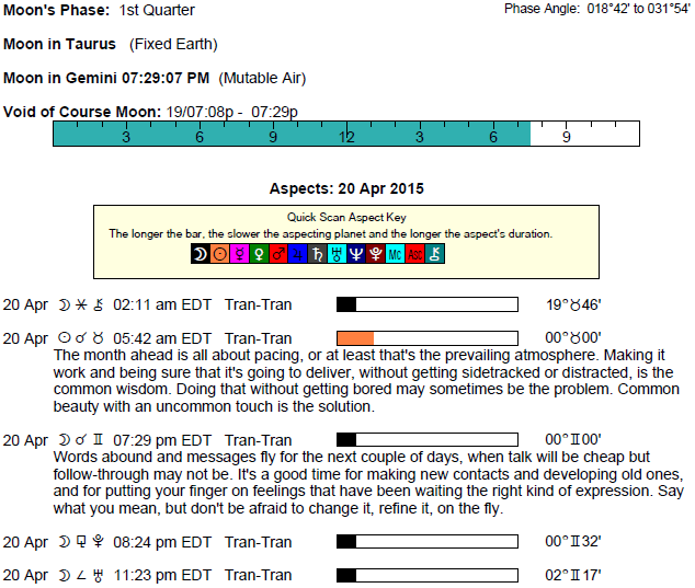 Today, the Sun enters the Fixed Earth sign, Taurus. We’re more practically, materially, and sensually oriented during this month-long cycle. While the Taurus Sun is a practical energy, an approaching Mercury-Jupiter square can promote impractical thinking. It’s a good time for thinking big, but refinements will likely be necessary later, if these take off at all. Watch for exaggeration – making too much of something.