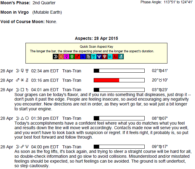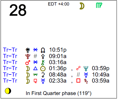 The following aspects (major only) and positions are at noon (EDT) on April 28th: