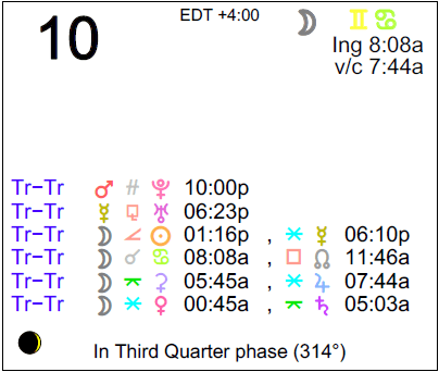 The following aspects (major only) and positions are at noon (EDT) on August 10th: