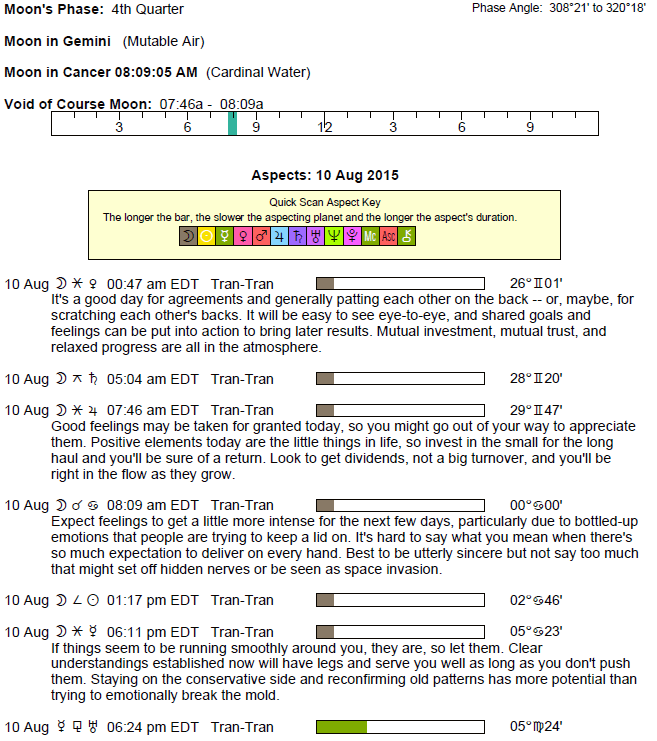 Note that the Moon moves at a rate of approximately one degree every 2 hours, so that if an aspect involving is applying and has an orb of 5 degrees, the aspect will perfect (be exact) in about 10 hours. If the Moon is separating from an aspect with an orb of 2 degrees, it has already formed said aspect approximately 4 hours ago (since the following are positions at noon today, then it would have occurred at about 8 AM today).