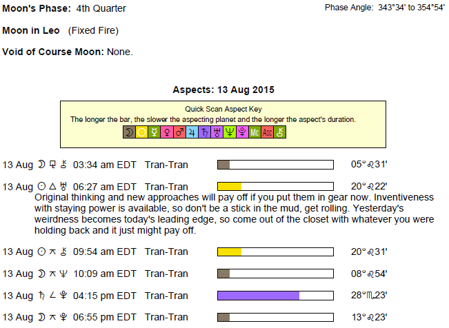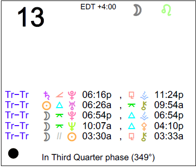 The following aspects (major only) and positions are at noon (EDT) on August 13th: