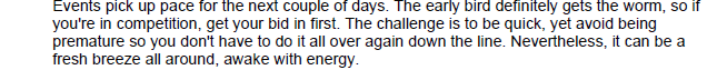 An auspicious time for any project demanding endurance or tolerance. Also good for establishing new habits and rituals.