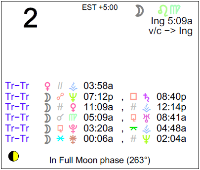 Note that the Moon moves at a rate of approximately one degree every 2 hours, so that if an aspect involving is applying and has an orb of 5 degrees, the aspect will perfect (be exact) in about 10 hours. If the Moon is separating from an aspect with an orb of 2 degrees, it has already formed said aspect approximately 4 hours ago (since the following are positions at noon today, then it would have occurred at about 8 AM today).