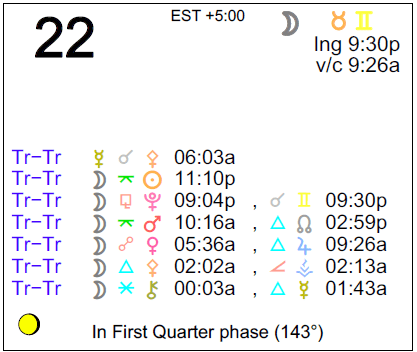 If you’re astrologically inclined and interested in the details of the Astrology of today, here are some of the factors considered in the forecasts (for the astrology of the week, see This Week in Astrology):