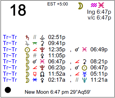 - A New Moon occurs at 6:47 PM in Aquarius.
