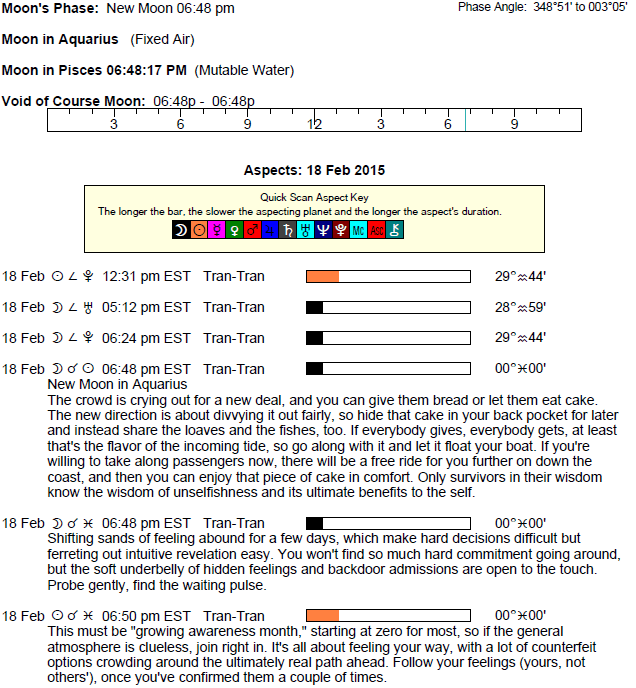 A New Moon occurs today at the very end of Aquarius (a New Moon occurred on January 20th very near the beginning of the sign). We could be more impulsive at this time, as we can be anxious to put an end to something so that we can move forward. The Sun enters Pisces two minutes after the New Moon today.