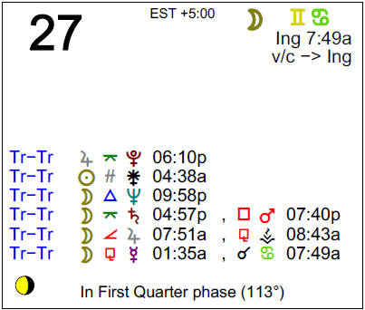 The following aspects (major only) and positions are at noon (EST) on February 27th: