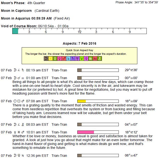 The following aspects (major only) and positions are at noon (EST) on February 7th: